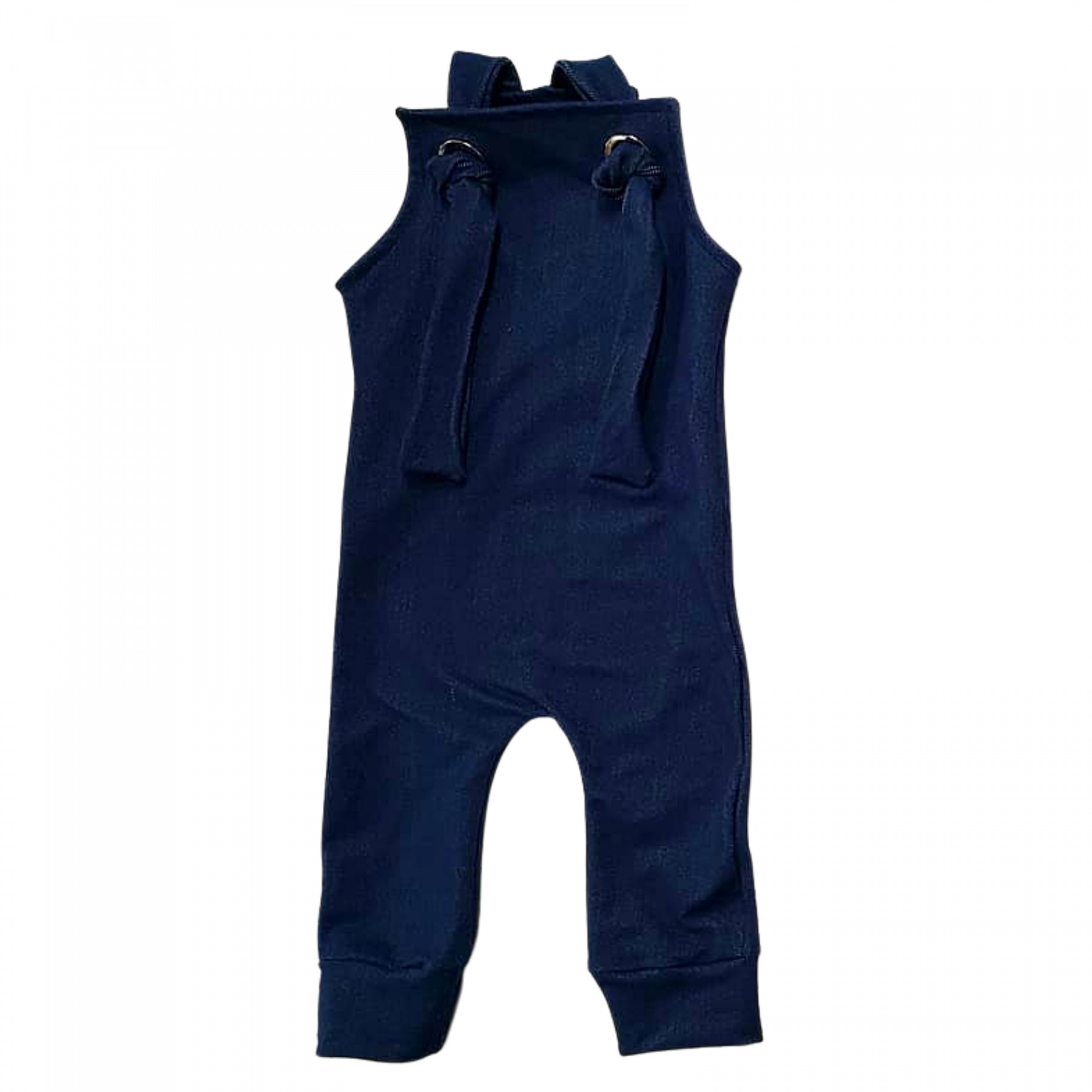Jardineira de coton imita jeans.